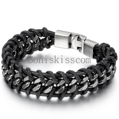 Black Braided Leather Silver Stainless Steel Cuban Chain Men’s Bracelet Bangle